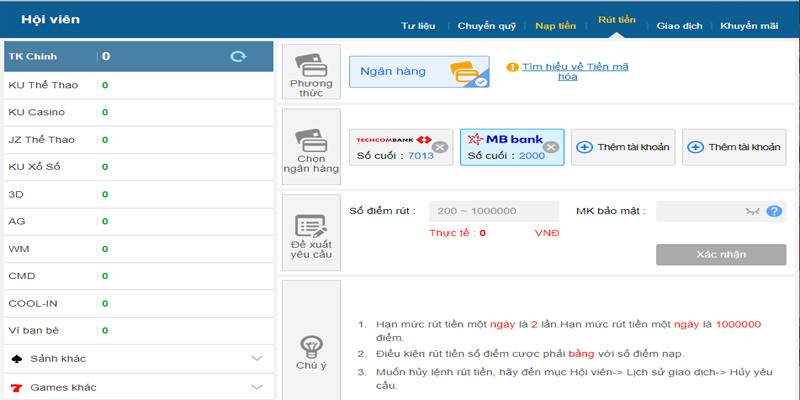 - Chọn chức năng “Rút Tiền” và xác nhận mật khẩu rút tiền (đã thiết lập trước đó).